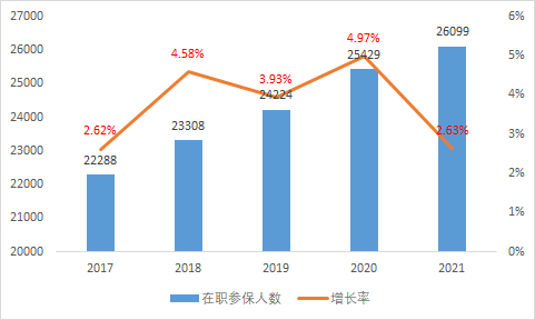 圖表2:2017-2021年在職職工參保人數統計 單位(萬人)