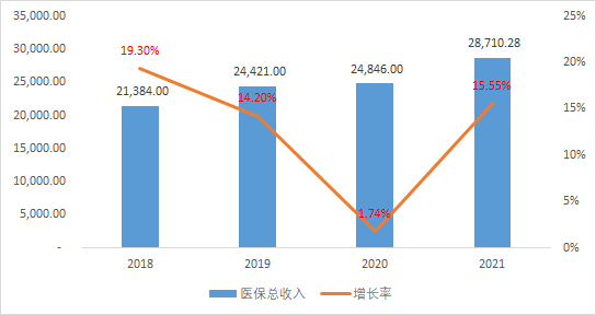 2021年,基本醫療保險基金(含生育保險)總收入、總支出分別為28710.28億元、24011.09億元,年末基本醫療保險(含生育保險)累計結存36121.54億元。