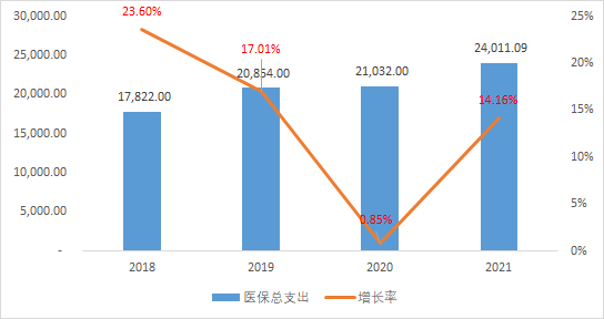 醫保基金支出近4年年復合增長率達10.45%,醫保支出的增速略大于醫保收入的增速。但值得注意的而是,從2020年開始,醫保支出的增速開始小于醫保收入的增速,說明國家醫保控費取得較好的效果。