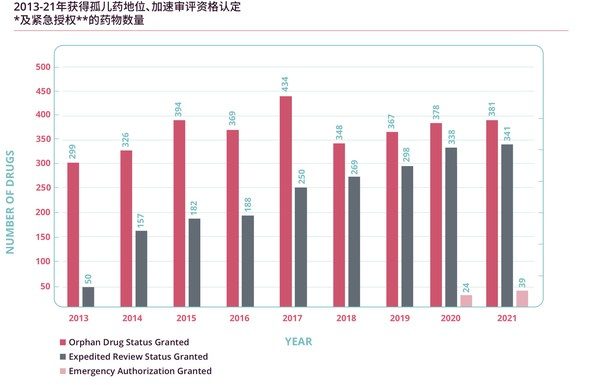 圖3 2013-2021年獲得孤兒藥地位、加速審評資格認定及緊急授權的藥物數量(Informa Pharmaprojects, 2022年1月)